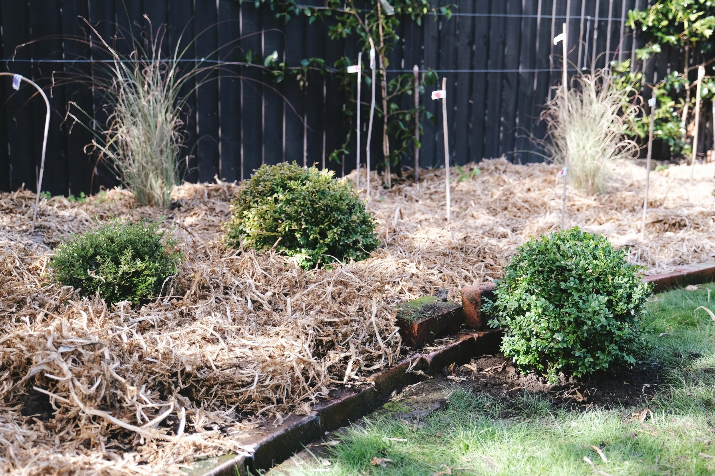 Topiary balls have become a firm favourite of mine, with their smooth surfaces adding an interesting contrast to the rigid edges of the brick elements and the softness of my seasonal planting. I have dotted them through the beds like comical full stops, or at the very least, a moment for the eye to rest amid the sparse winter or chaotic summer. I’ve even let one bounce out of the garden to perch on the lawn, breaking up for a moment the smoothing leading lines of the bed edges and green of the grass. The collection is mostly made up of excruciatingly slow growing (and expensive), commonly used Buxus sempervirens balls which I mixed with the faster growing (sometimes annoyingly so!) Lonicera nitida. They have all been moved around the garden multiple times and continue to thrive with no trouble.