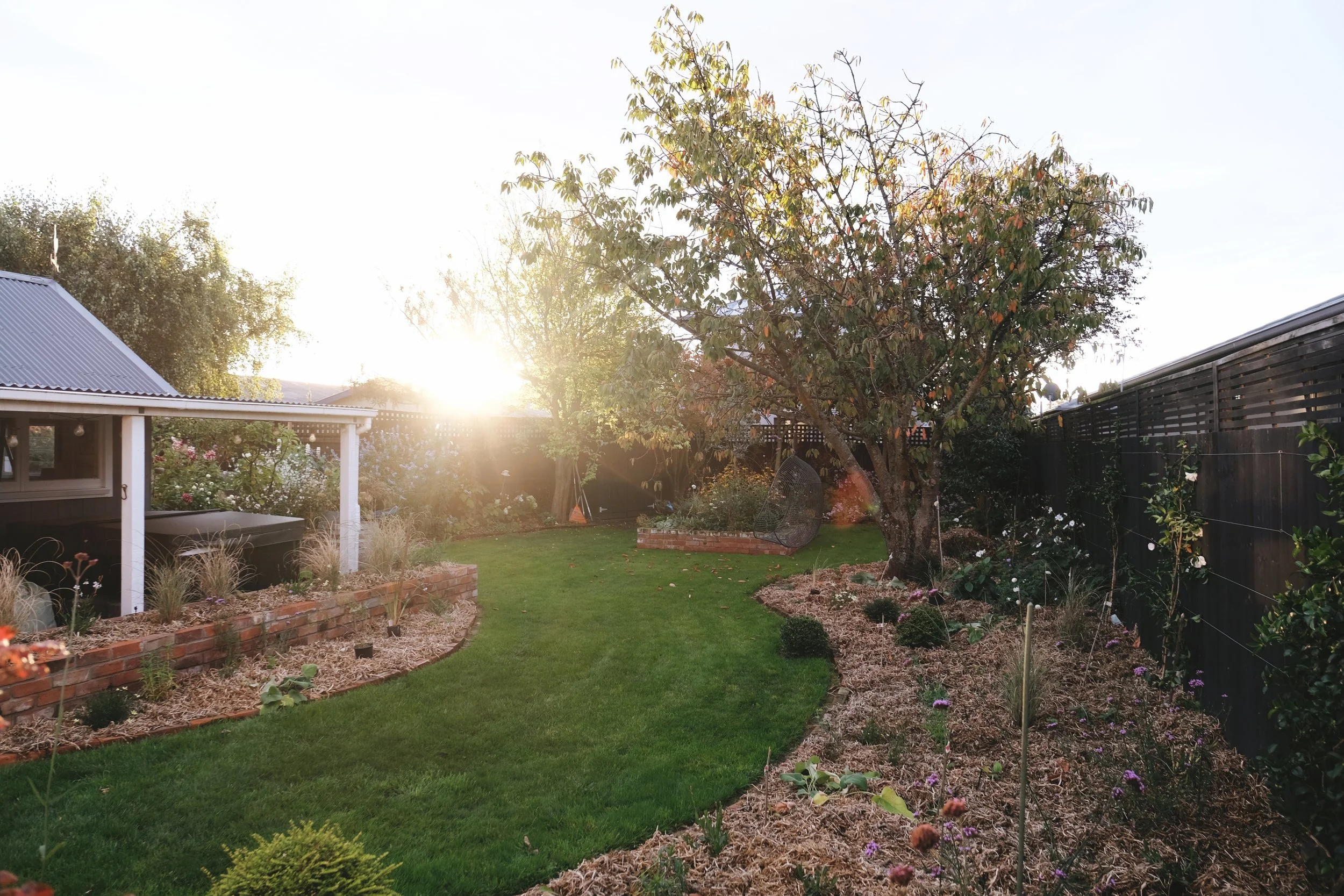 Garden beds simply following fence lines with square edges. The lawn is less of a design feature as it is below.