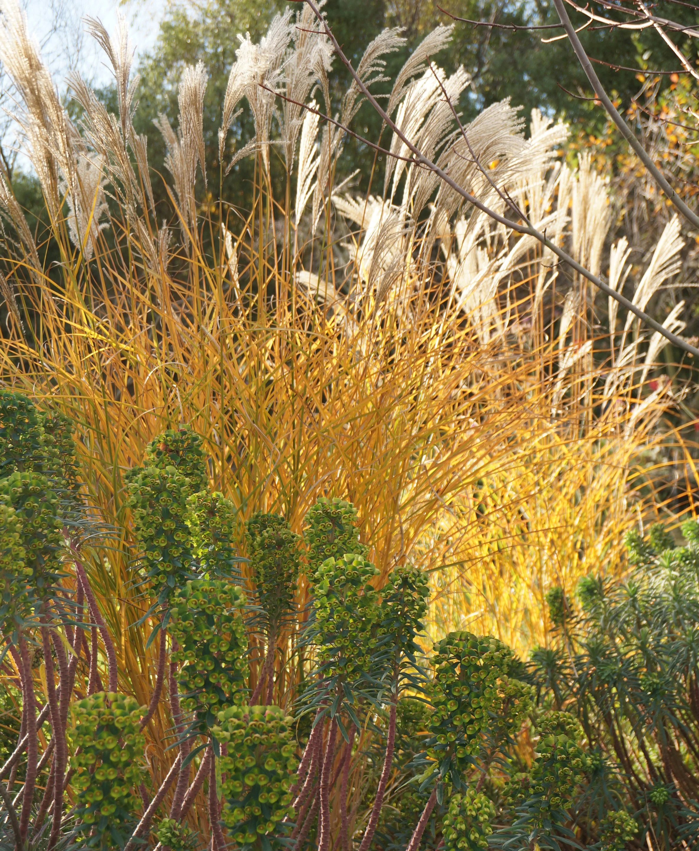 Golden leaves of Prunus x yedoensis ‘Mountain Haze’ blossom tree, deep burgundy leaved hebe ‘Santa Monica’, Chionochloa rubra red tussock grass native to NZ - this is Jenny’s favourite grass being so architectural and self-cleaning but it does need supplemental water at times. Bupleurum furticosum peeping up in the front with Euphorbia wulfenii behind hebe, with the purple-tinged leaves of Viburnum plicatum.